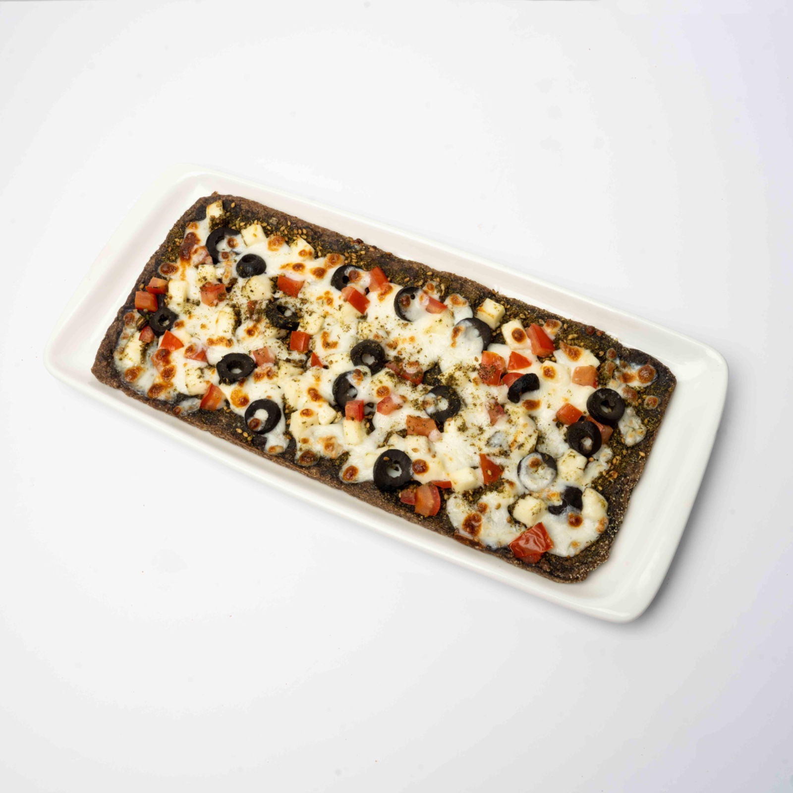 low fat hallomi cheese, zatar, black olive, tomato, our special brown bread .(protein 30 carb 63 fat 16 cal 516)