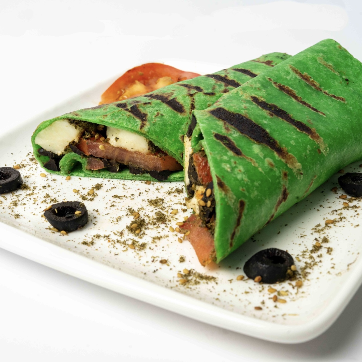 Low Fat Hallomi Cheese, Tomato, Olive, Zaatar