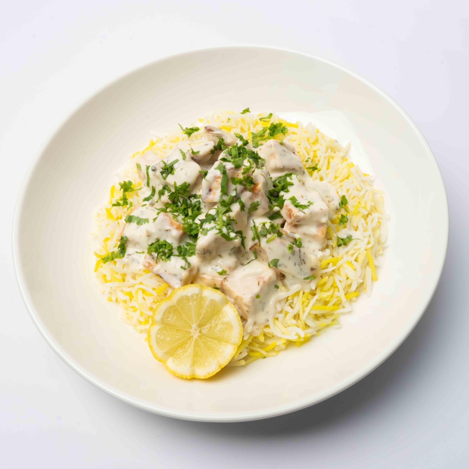 grilled chicken,special sauce whait sauce,coming with rice Weight : protein 100 g / carbs100 g (protein 34 Carbs 32 Fat 8 cal 336)