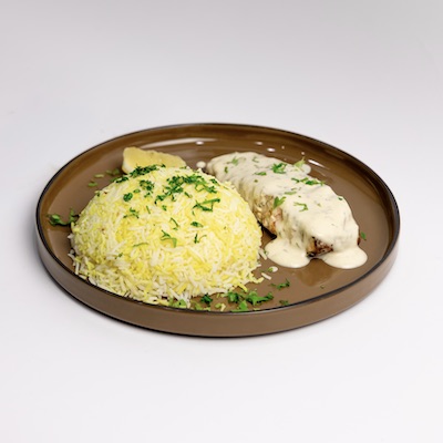 grilled salmon,our special whait sauce,coming with rice. Weight : protein 100 g / carbs100 g (protein 28 Carbs 34 Fat 12 cal 347)