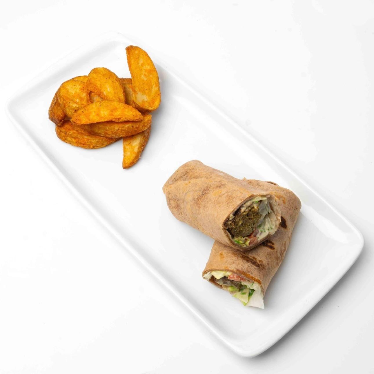special tahena sauce, coming on a whole wheat tortilla. (protein 38 Carbs 37 Fat 16 Cal 448)