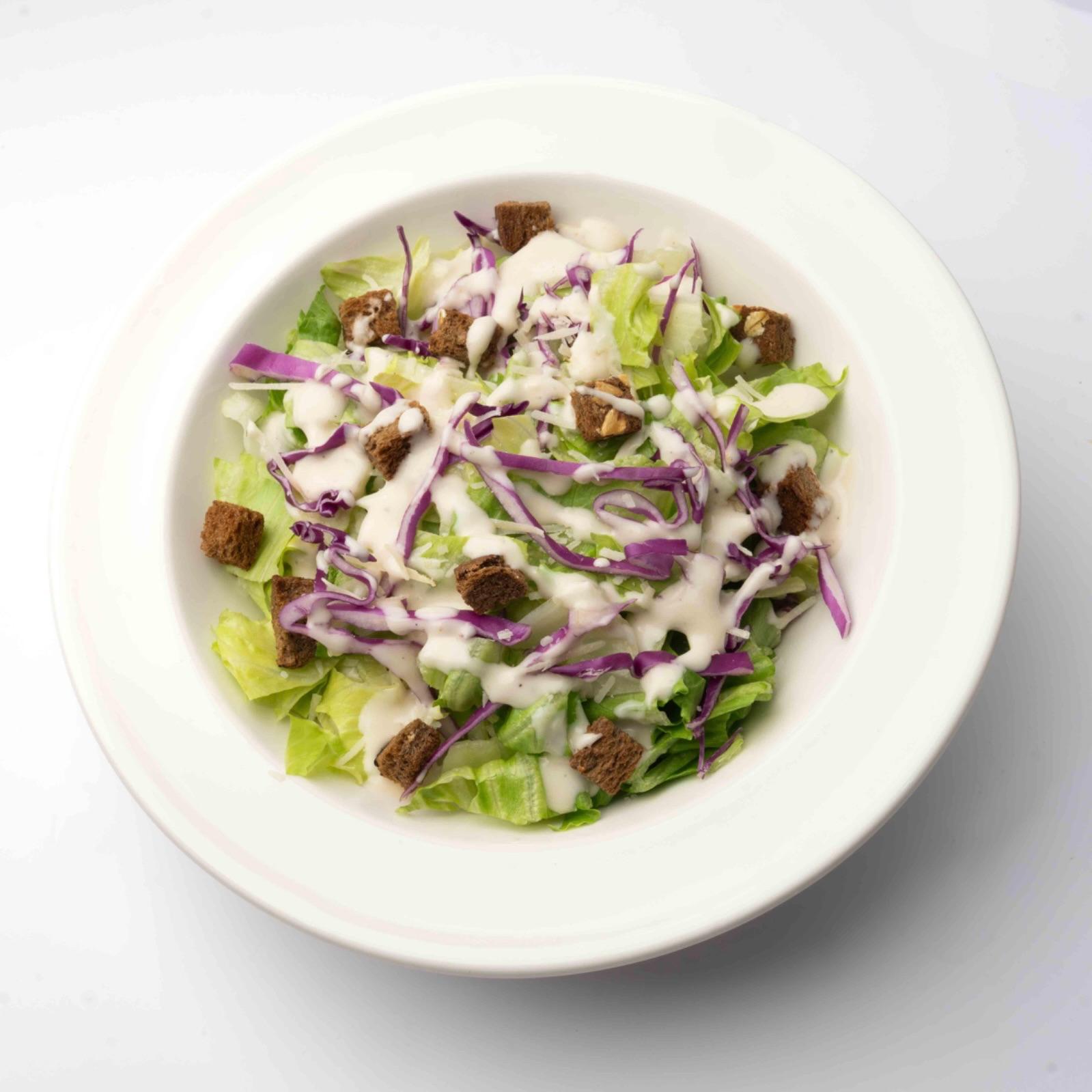 parmesan cheese and zero-carb caesar dressing on lettuce & red cabbage