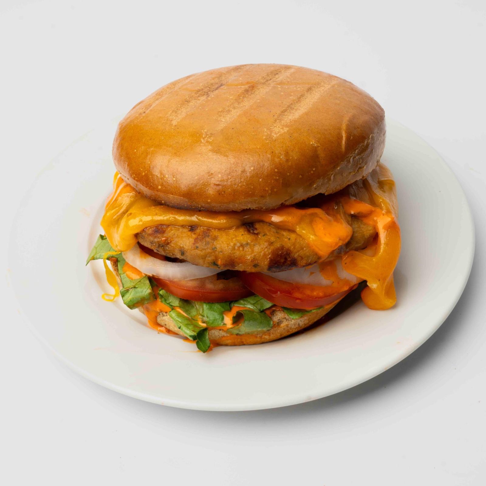 grill turkey burger, turkey bacon, reduced fat cheddar romaine, tomatoes and onion,lettuce, with our zero carb signature sauce, served on a whole wheat bun. (protein 44 Carbs 43 Fat 16 Cal 493)