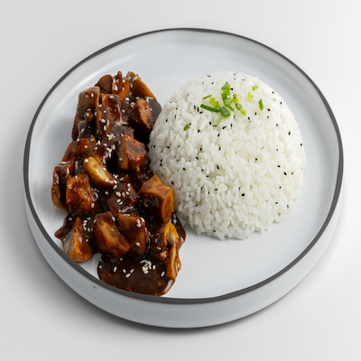 Grilled chicken - mushrooms - teriyaki sauce - Asian rice Weight: Protein 100 / Carbs 100 Protein 34, Carbs 36, Fat 9, Calories 361