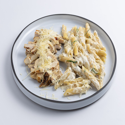 Penne pasta with a special truffle sauce, grilled chicken pieces, and